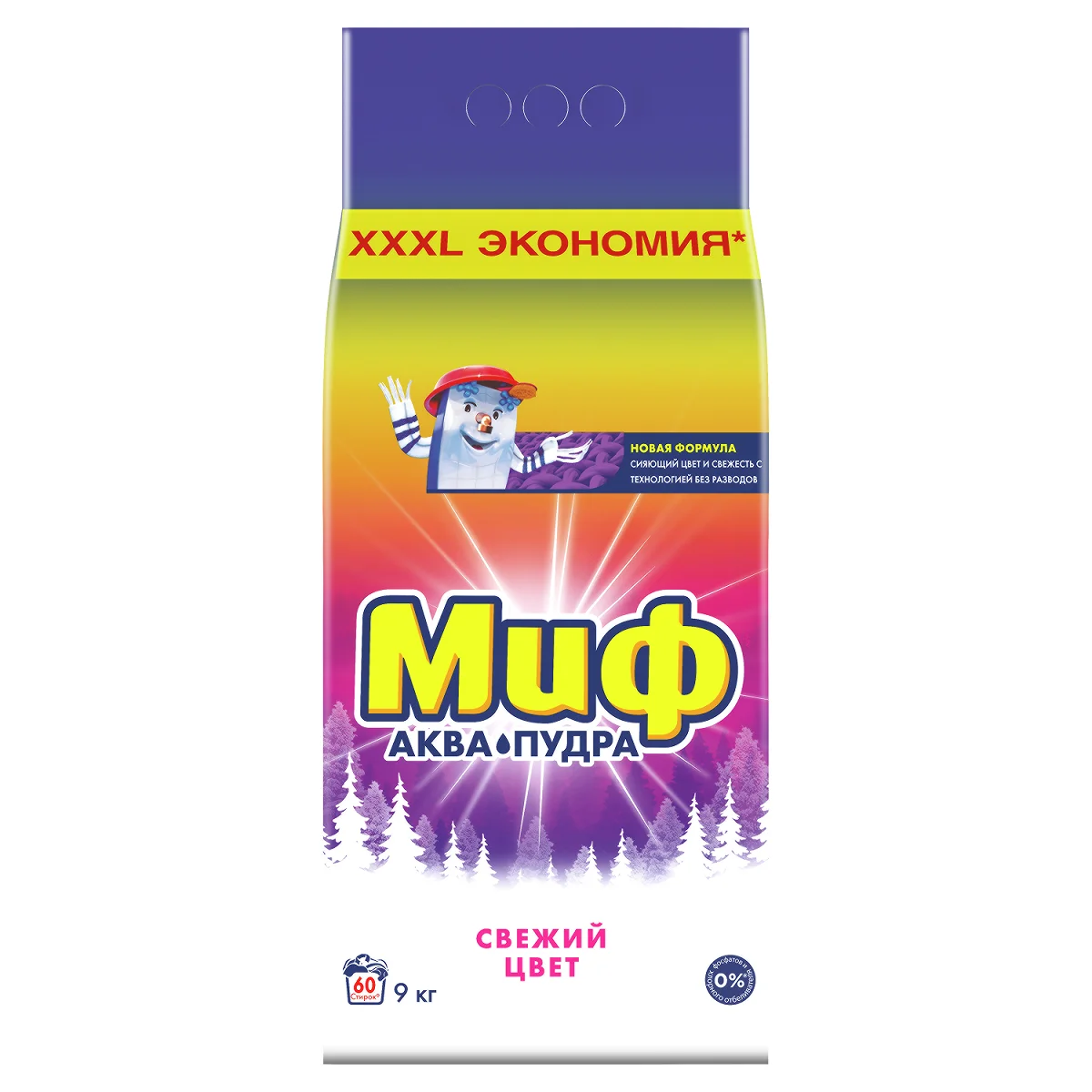 С помощью технологии против разводов, Миф помогает эффективно справляться с загрязнениями, не оставляя разводов на одежде. Только чистота и морозная свежесть!